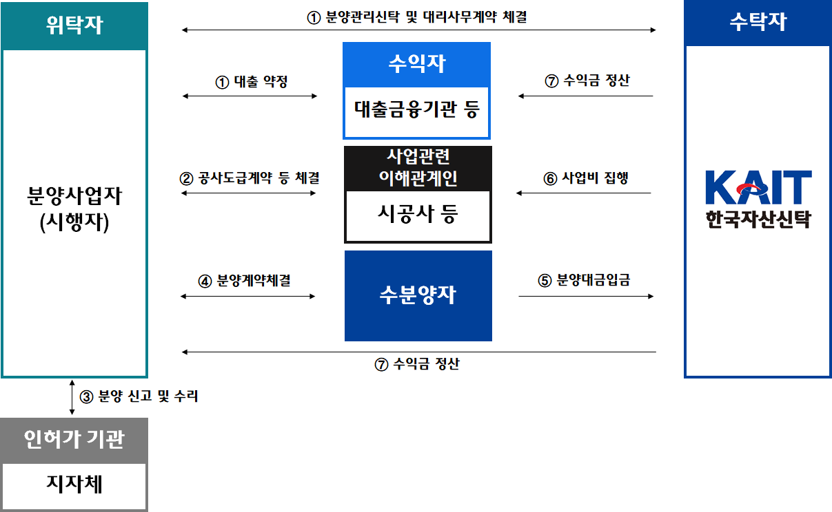 사업시행자(위탁자)는 신탁회사와 신탁계약 및 대리사무계약을 체결하여, 신탁회사가 사업부지 소유권 및 분양대금을 보관 및 집행하게 되며,