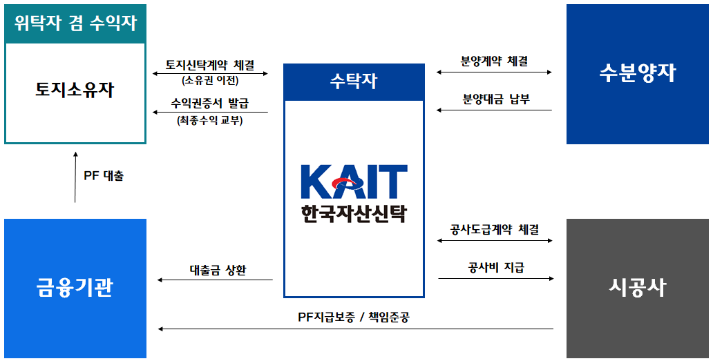 고객님(위탁자)이 사업비를 금융기관 등으로 부터 조달하고, 신탁회사가 사업의 시행자(사업주체)가 되어 사업을 관리하는 신탁제도입니다.