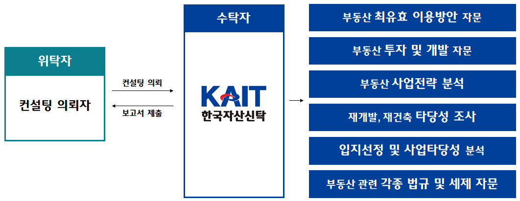 대상 부동산의 입지 환경과 잠재적 특성을 조사, 분석, 예측하여 부동산의 최적이용 방안 및 자금조달, 사업시행 방안 등을 보고서로 만들어 제시하여 드립니다.